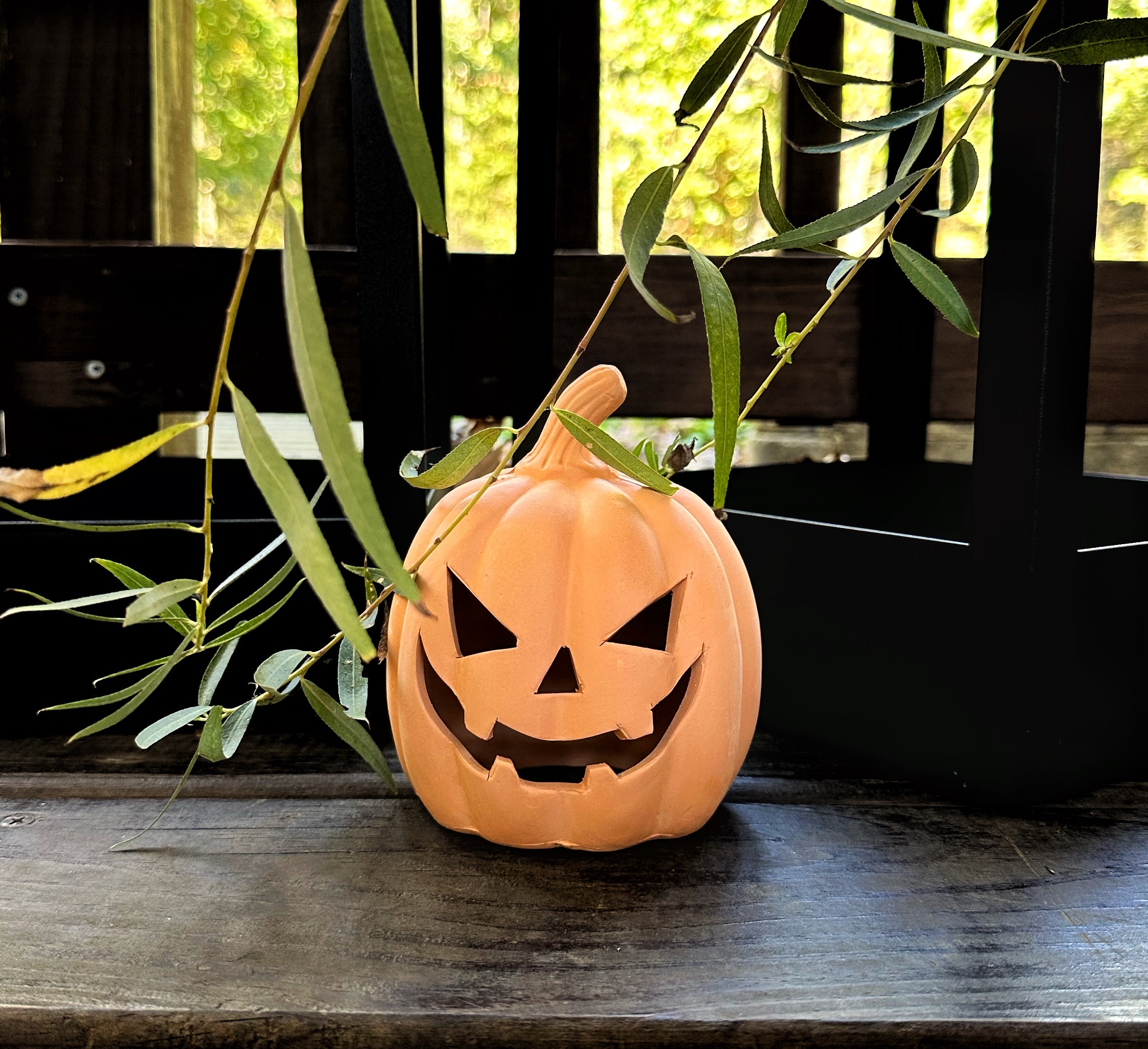 Carved from terracotta, this jack-o'-lantern combines a traditional Halloween festivity with rustic autumn charm. Illuminate the warm, earthy tones of the natural clay and embrace the spirit of the season by adding a candle or fairy lights inside to create a cozy, spooky glow.